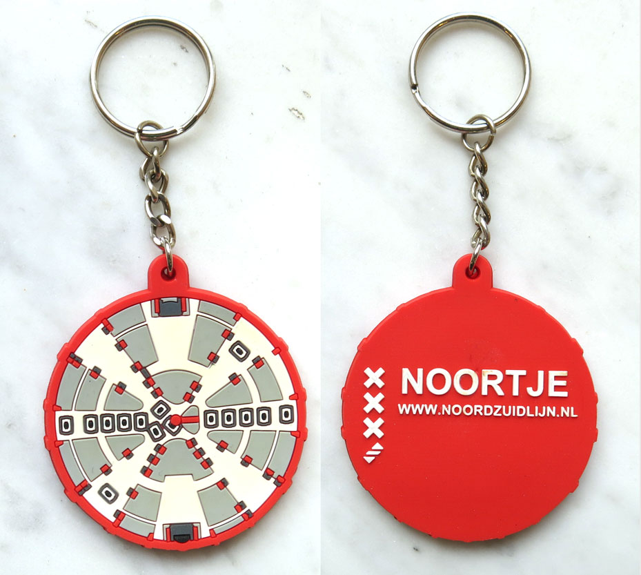 Deze sleutelhanger is gemaakt als aandenken aan de tunnelboor Noortje, die gebruikt is voor het graven van metrotunnels voor de Noord/Zuidlijn. In 2002 nam de Gemeente Amsterdam het definitieve besluit tot de aanleg van de Noord/Zuidlijn, een metrolijn die het mogelijk maakt binnen zestien minuten van het Buikslotermeerplein naar Station Zuid te reizen. De lijn zal straks een geschat aantal van 121.000 passagiers per dag vervoeren. De sleutelhanger is onderdeel van een set van twee. Beide sleutelhangers kennen min of meer dezelfde voorzijde, maar dan uitgevoerd in andere kleuren. Op de achterzijde is te lezen dat de rode sleutelhanger bij tunnelboor Noortje hoort en de blauwe bij tunnelboor Gravin. ( Sarah Remmerts de Vries)