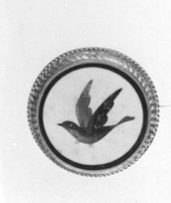 Mozaïek van gekleurde stukjes op wit benen fond met zwart randje, vogel voorstellend. Brede, aflopende bewerkte gouden rand.- Trefwoorden