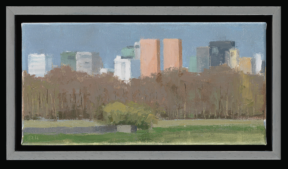 Kunstschilder Gineke Zikken heeft een serie schilderijen gewijd aan de ontwikkeling van de Amsterdamse Zuidas. Deze ontwikkeling is gestart aan het begin van de jaren 1990, met de vestiging van het hoofdkantoor van ABN AMRO. De goede bereikbaarheid en nabijheid van Schiphol maakten dat steeds meer bedrijven volgden. Op het schilderij liggen de hoge kantoortorens deels verscholen achter het groen. De twee opvallende roodbruine gebouwen zijn de Amsterdam Symphony torens, ontworpen door architect Pi de Bruijn. Zikken stond waarschijnlijk in een park ten zuiden van de Zuidas toen ze deze voorstelling vastlegde. ( Sarah Remmerts de Vries)
