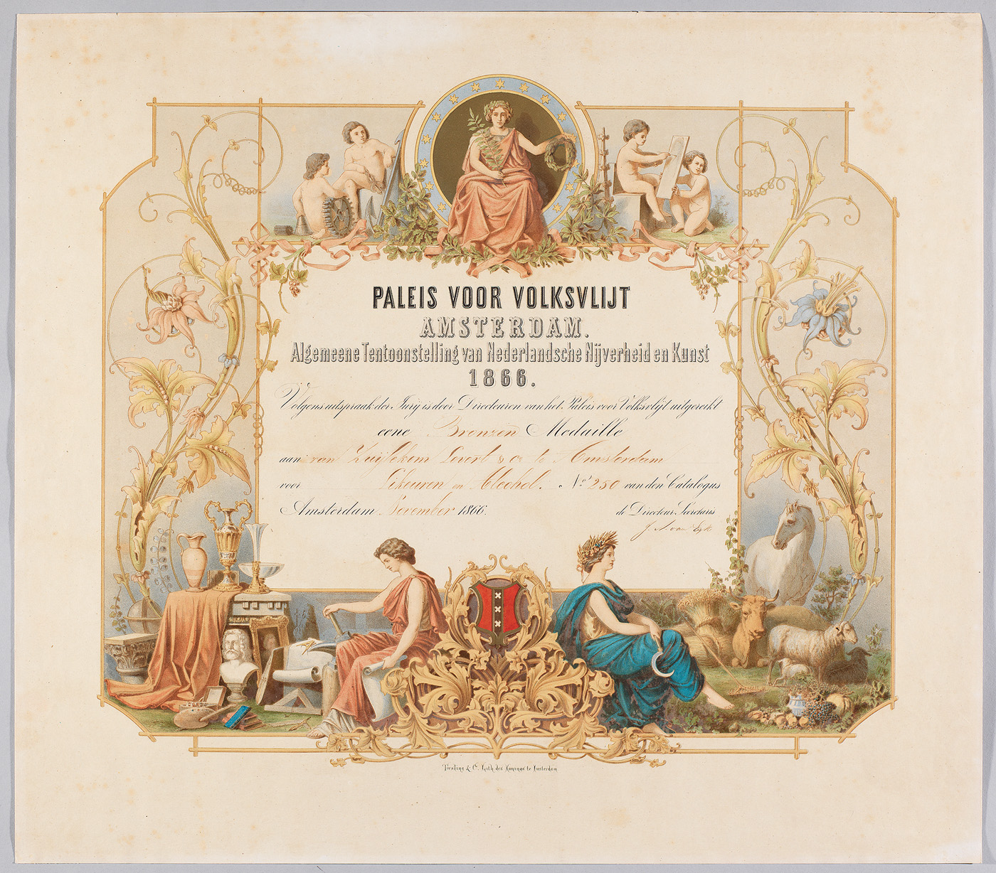 - Document i.v.m. uitreiking bronzen medaille aan Van Zuylekom/Levert & Co in het Paleis voor Volksvlijt, 1866