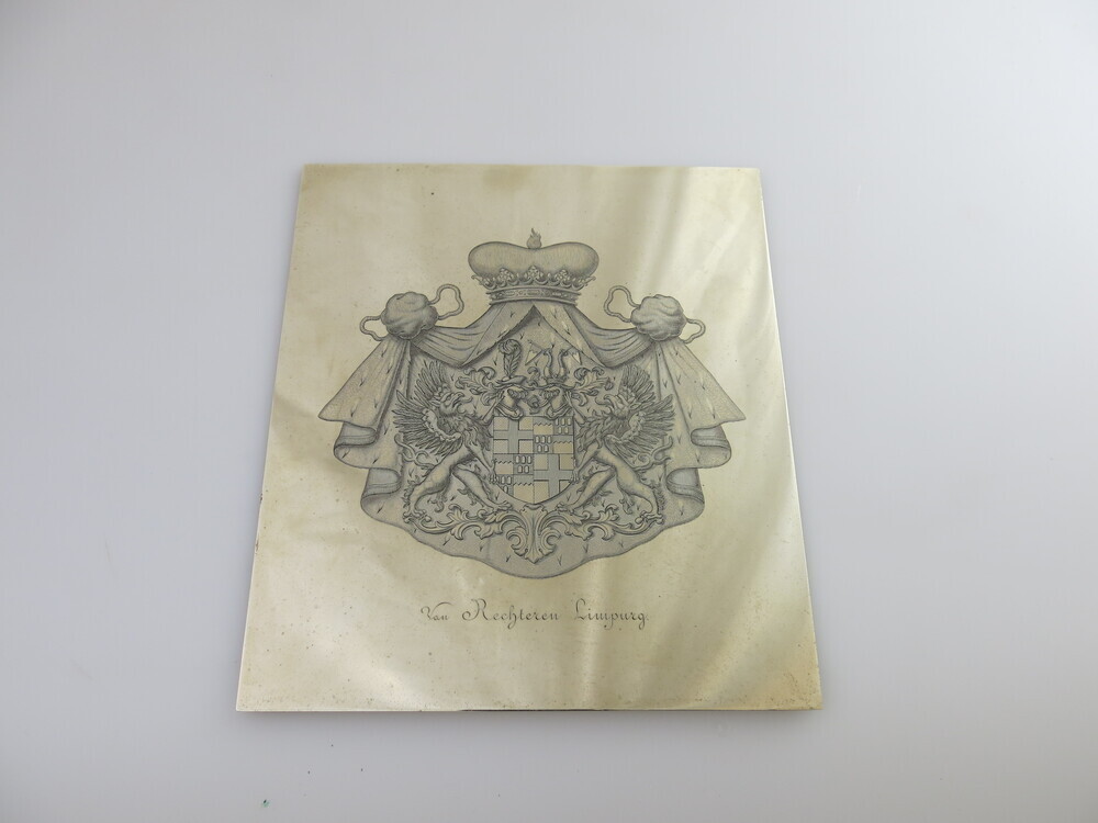 Blankmetalen plaquette met wapen en daaronder familienaam Van Rechteren Limpurg gegraveerd.- Trefwoorden