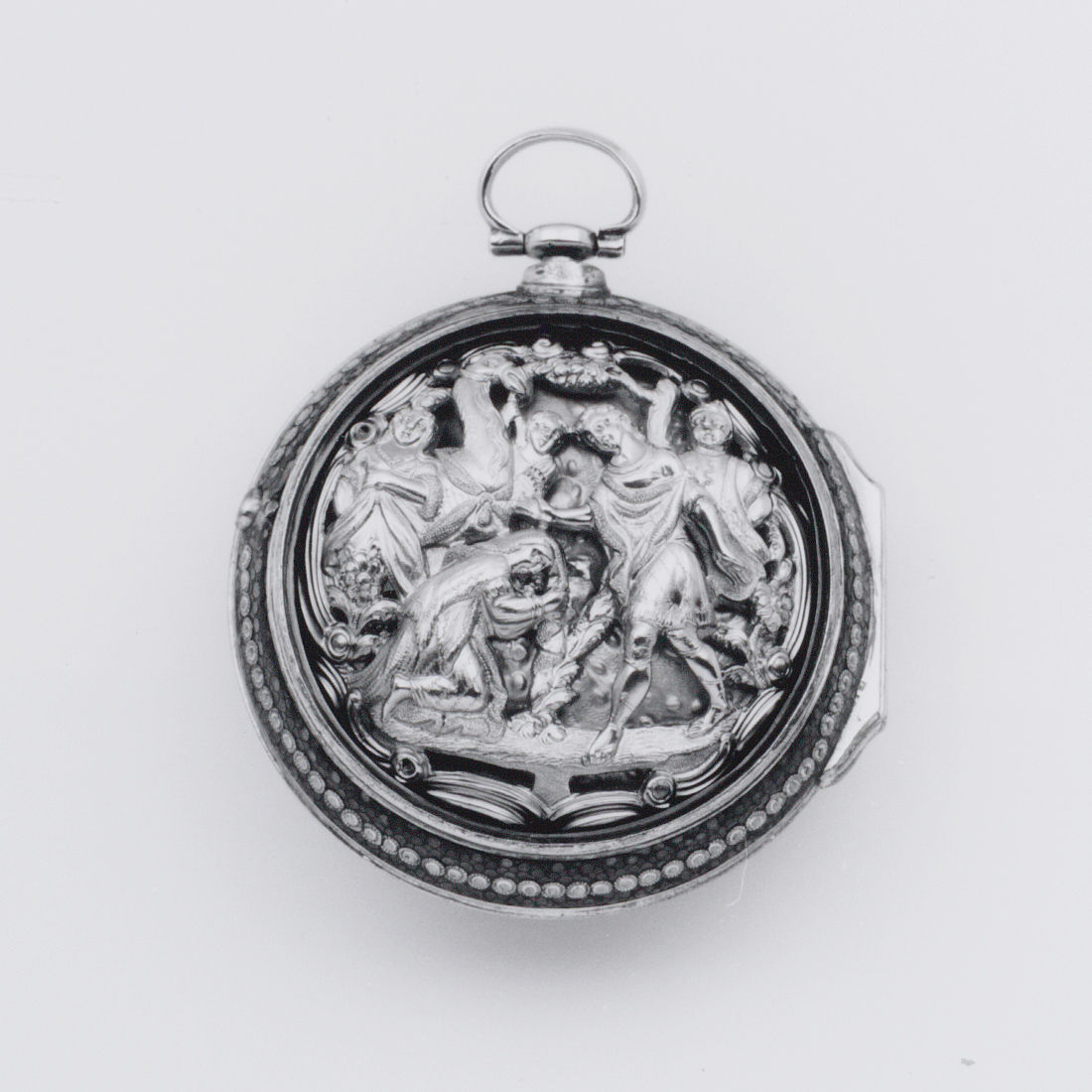 Mevrouw Lopez Suasso-de Bruijn zag in het bijbelse decoratiemotief van de buitenkast een voorstelling van de koophandel (*Lopez Suasso-de Bruijn, [ca. 1885], [p. 75] nr. 74). Gezien het gelijktijdig voorkomen van de namen van twee uurwerkmakers zal het horloge in de negentiende eeuw uit verschillende oudere onderdelen zijn samengesteld. Dergelijke 'mariages' kwamen toen vaker voor.
