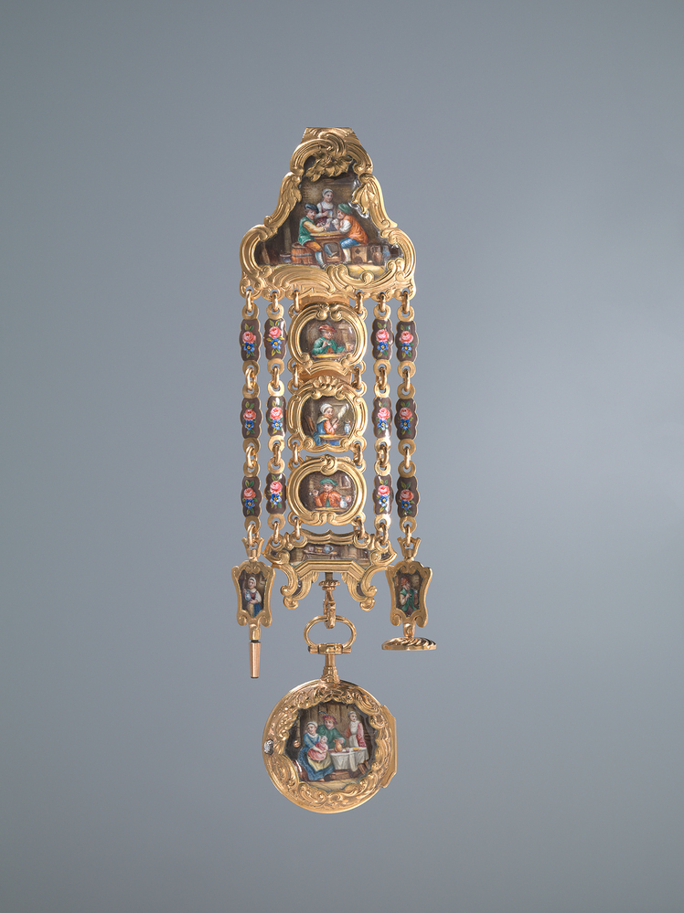 - Horloge met spillegang en latere chatelaine met emaildecor van boerentaferelen, 1770