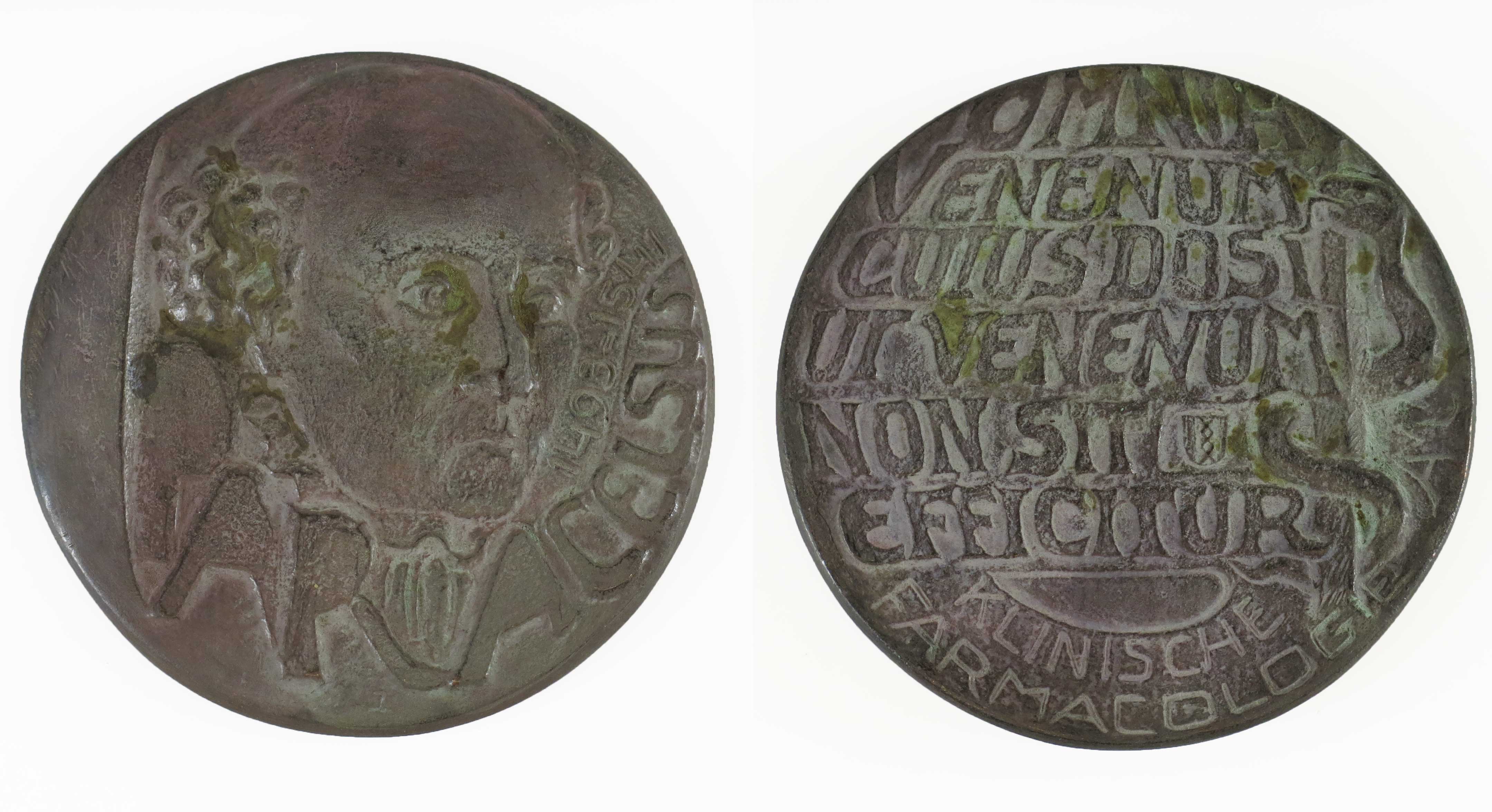 Deze bronzen penning is vervaardigd voor de afdeling Klinische Farmacologie van het Academisch Medisch Centrum te Amsterdam. De voorzijde toont een portret van de controversiële Zwitserse arts Paracelsus (1493-1541). Paracelsus was een omstreden figuur, die de klassieke geneeskunde verwierp en zijn kennis van alchemie, natuurwetenschap en volksgeneeskunde combineerde tot eigen theorieën over genezing. Als (militair) geneesheer paste hij deze theorieën vervolgens door heel Europa toe. Op de keerzijde van de penning is de Latijnse tekst OMNIM / VENENUM / CUIUS DOSI / UT VENENUM / NON SIT / EFFICITUR te lezen, die verwijst naar een scheikundige benadering van vergiften. Erbij staan de naam van de AMC-afdeling en een klein wapen van Amsterdam, met de drie Andreaskruizen. ( Sarah Remmerts de Vries)