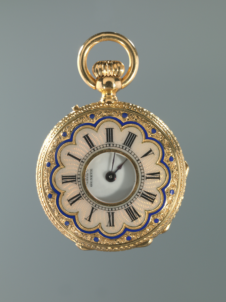 - Miniatuurhorloge, type ‘half-hunter’, versierd met emaildecor van een boeket korenbloemen, 1865 - 1885