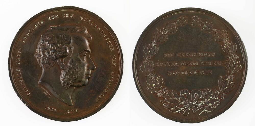 Deze bronzen penning is geslagen ter gelegenheid van het aftreden van Cornelis Jacob Arnoldus den Tex (1824-1882) als burgemeester van Amsterdam. Den Tex was van 1868 tot 1879 burgemeester van de hoofdstad. De voorzijde van de penning toont een en profil portret van Den Tex, met krullend haar en lange bakkebaarden. Op de keerzijde is een lauwerkrans van onder meer eikenbladeren afgebeeld, met in het midden de tekst DIE GEENS DINGS / EERDER MOEDE SCHEEN / DAN DER RUSTE, verwijzend naar de onvermoeibare en doortastende houding van Den Tex als burgemeester. ( Sarah Remmerts de Vries)