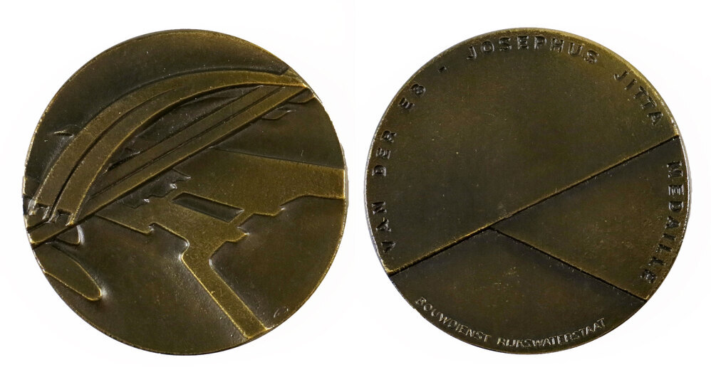 Deze bronzen medaille is uitgegeven door Bouwdienst Rijkswaterstaat. De medaille is genoemd naar ingenieurs Wijnand Jan van der Eb (1904-1966) en Jacob Paul Josephus Jitta (1893-1991), collega’s bij Rijkswaterstaat. Van der Eb is voornamelijk bekend geworden als ingenieur van de Van Brienenoordbrug. Josephus Jitta ontwierp toen hij 23 jaar was de sluizen van IJmuiden. Deze penning is afkomstig uit het bezit van de Amsterdamse familie Josephus Jitta. De voorzijde toont een abstracte afbeelding van een brug. Op de keerzijde is rond een spel van lijnen de titel VAN DER EB – JOSEPHUS JITTA MEDAILLE aangebracht, evenals de naam van de uitgever: Bouwdienst Rijkswaterstaat. ( Sarah Remmerts de Vries)