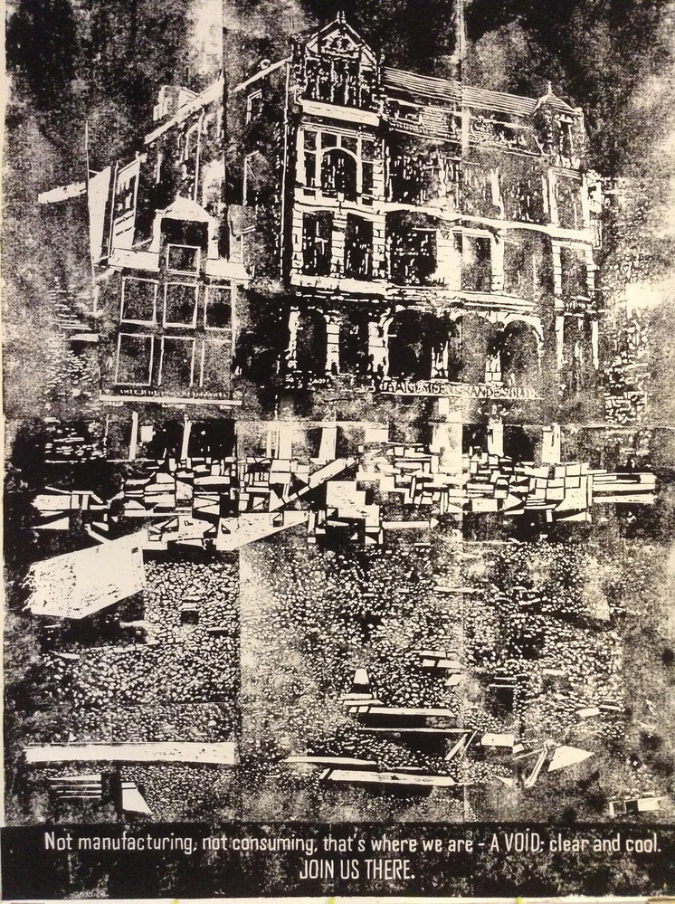 Deze linoleumsnede is door kunstenaar Lawrence James Bailey vervaardigd voor de tentoonstelling ‘Van Perskamer tot Kunstpaleis’ in het gebouw van het Algemeen Handelsblad. Het gebouw zelf is hier afgebeeld, als verlaten historische plek die niet langer de functie vervuld waarvoor hij ooit bedoeld was. Bailey wil toeschouwers met Join Us There creatief laten nadenken en mijmeren over heden en verleden, werkelijkheid en fantasie. ( Sarah Remmerts de Vries)