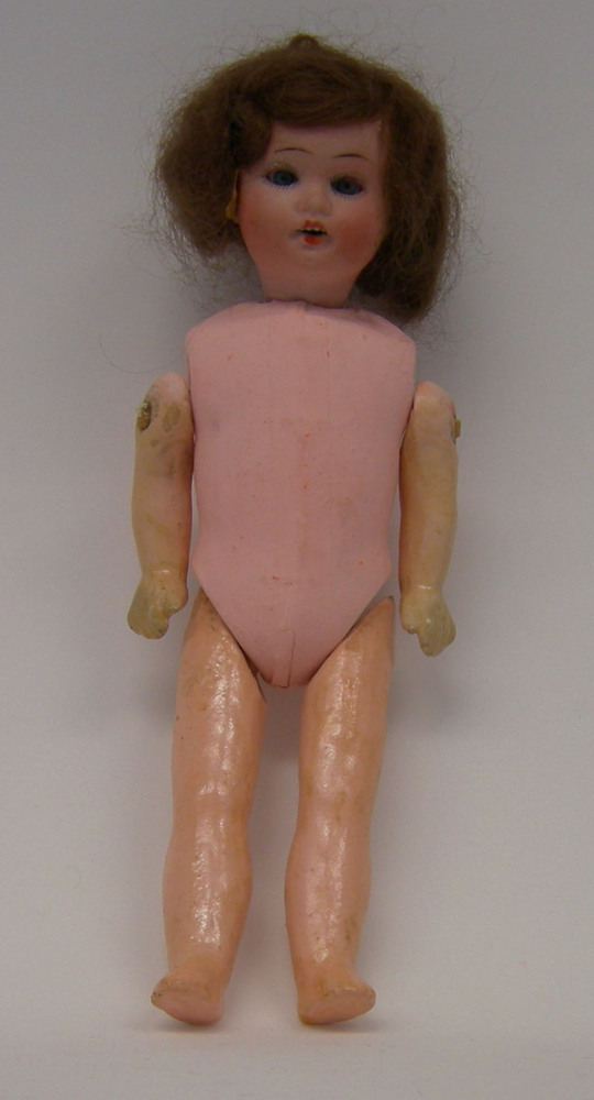 Pop bestaande uit porseleinen hoofd met beweegbare ogen, ledematen en lijf van papier maché, Ledematen met koordje aan lijf bevestigd, met een houten plugje in de ledematen. Bruine pruik met haarspeld aan achterzijde op hoofd gelijmd.