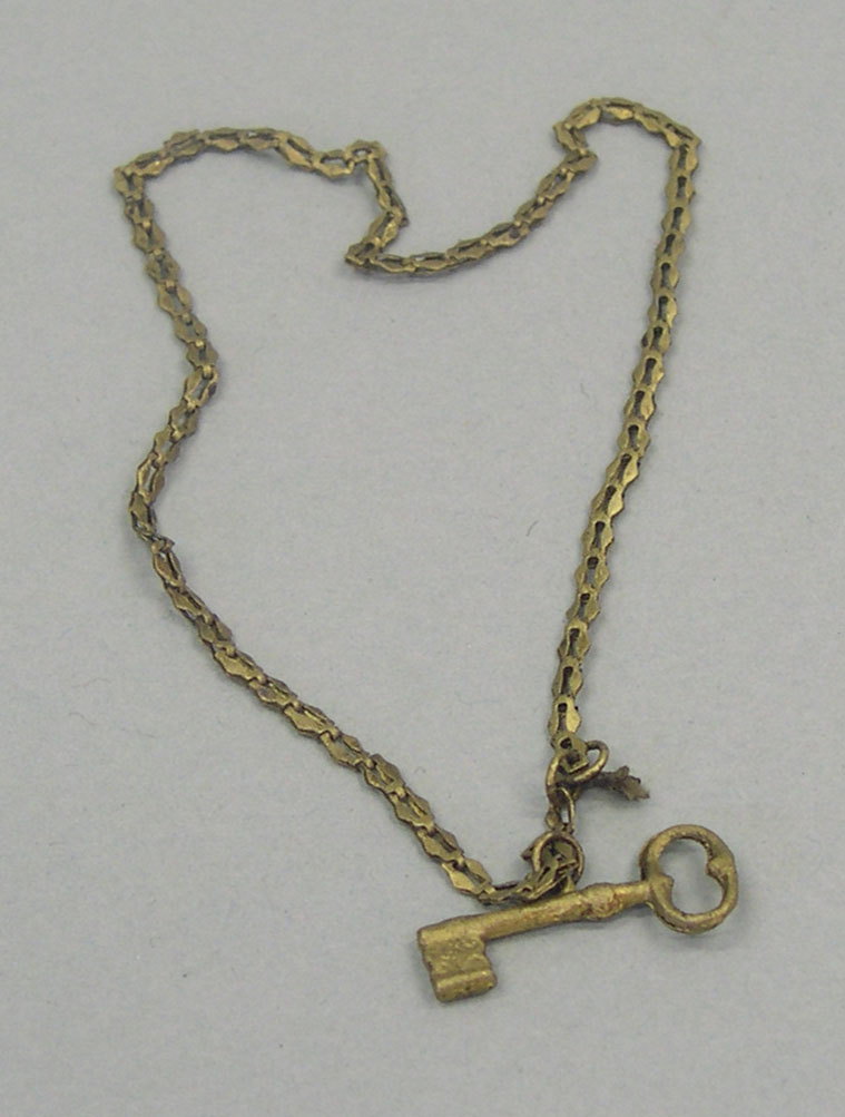 Koperkleurige schakelketting, waaraan een sleutel hangt.- Trefwoorden