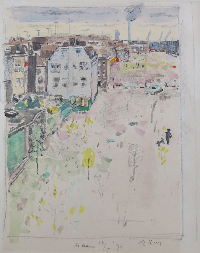 Als de Dordrechtse schilder Otto Boudewijn de Kat (1907-1995) in de jaren zestig naar Amsterdam verhuist, is hij getuige van een stad in de maak. Rond 1970 wordt begonnen met grootschalige stadsvernieuwing. Ook de Haarlemmer Houttuinen, een vervallen volksbuurtje vlak naast de spoorlijn naar Haarlem en Zaandam, moet plaats maken voor een brede autoweg. De Kat, die destijds hoogleraar aan de Amsterdamse Rijksakademie voor Beeldende Kunst is, legt de gesloopte Houttuinen in 1974 meerdere malen vast. Het resultaat is een licht gekleurde aquarel met aan de linkerzijde huizen en aan de rechterzijde een stuk open groen, waar een figuur een hond uitlaat. In de verte zijn de kranen van het havengebied zichtbaar. ( Sarah Remmerts de Vries)