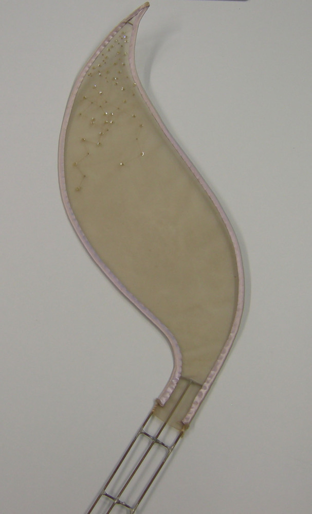 Rechtervleugel, onderdeel van outfit van Hellun Zelluf. Metalen rand waarover kusntstof tule is gespannen. Zijkant vastgenaaid aan het metaal met een paars biesje. Voorzijde bij de punt versierd met pailleten kralen.