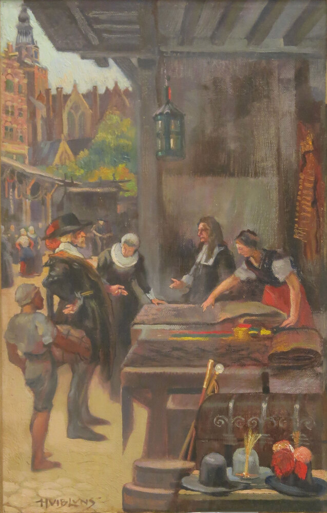 In 1937 gaf V&D een speciale kalender uit, ter gelegenheid van het vijftigjarig bestaan van de NV Amsterdamsche manufacturenhandel Vroom en Dreesmann. V&D was in 1887 te Amsterdam opgericht door de uit Veendam afkomstige Willem Vroom (1850-1925) en zijn zwager, de Duitse emigrant Anton Dreesmann (1854-1934). De kalender bestaat uit achttien platen, vervaardigd door kunstenaar Huib Luns, die samen op chronologische wijze de geschiedenis van de wereldhandel vertellen. De eerste plaat toont de tijd van jagers en verzamelaars, toen handel bestond in de vorm van ruil van levensbenodigdheden. De kalender eindigt met een plaat van een modern warenhuis van V&D, met deftige winkelaars en moderne leverancierswagens op de voorgrond. Op 31 december 2015 werd V&D failliet verklaard. ( Sarah Remmerts de Vries)