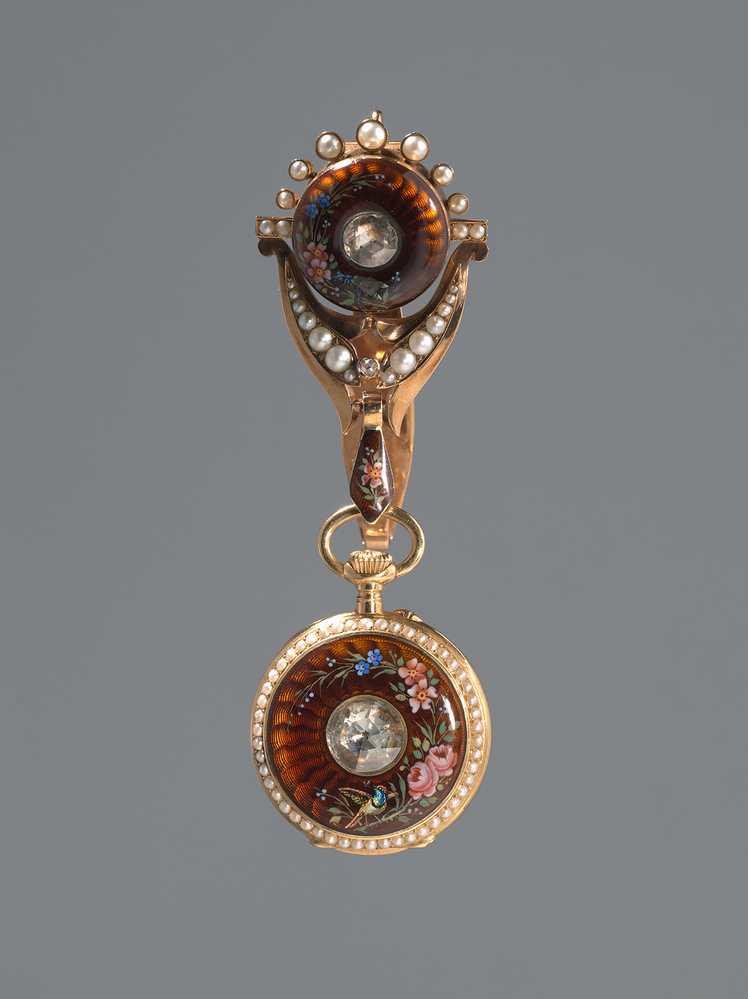 - Horloge met bijpassende chatelaine en emaildecor van bloemen, vogels en insecten, 1860 - 1880