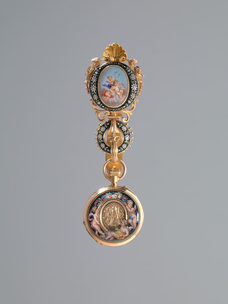 - Horloge, type ‘half hunter’, met bijpassende chatelaine en emaildecor van spelende putti, 1865 - 1885