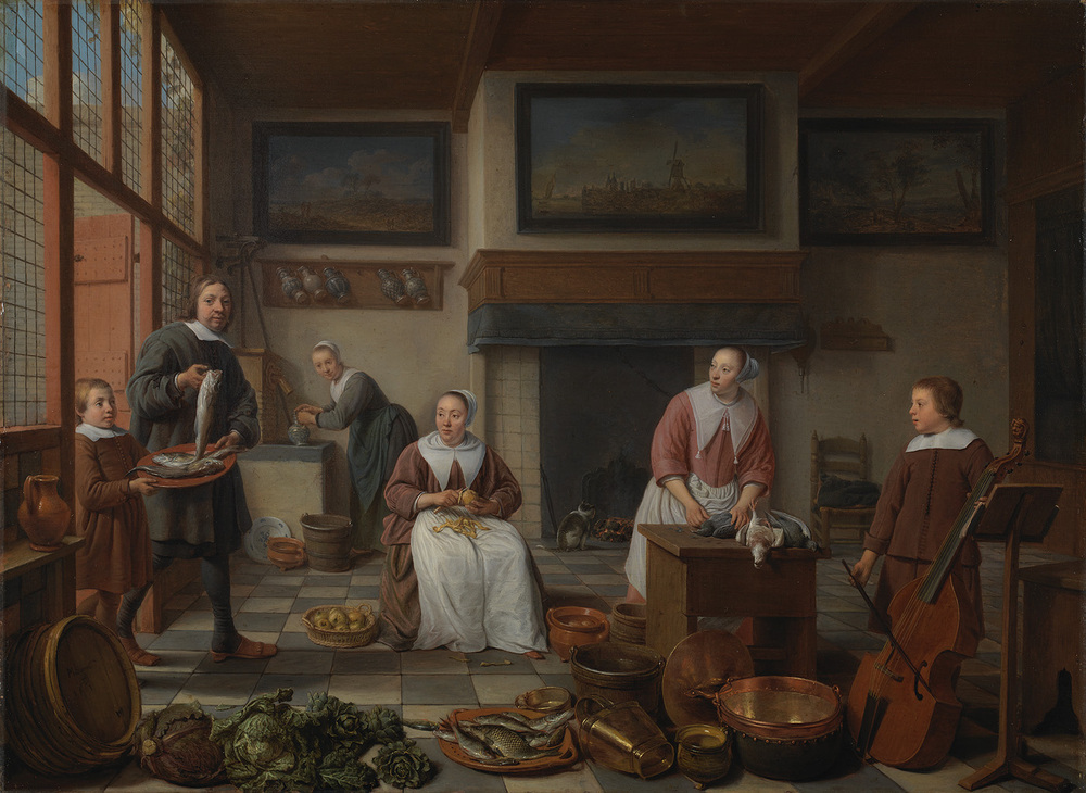 Dit schilderij toont het gezin van Jacob Bierens (1622-1664), een welgestelde doopsgezinde zijdehandelaar. Het gezin woonde tegenover de Oude Kerk in de Warmoesstraat, een wijk waar destijds veel geloofsgenoten woonden. Jacob draagt samen met zijn jongste zoon Anthony (1653-1738) een schaal met vis naar binnen. In zijn rechterhand heeft hij een vis bij de kieuwen vast. Jacobs echtgenote Cornelia van Hoeck (1627-1687) zit aardappels te schillen. Hun dochter Cornelia (1649-1719) ontdoet duiven van hun veren. Geheel rechts speelt de oudste zoon Abraham (1651-1686) op een viola da gamba. In de achtergrond is een dienstmeid bezig met het vullen van een kan met water. Alle blikken zijn gericht naar de pater familias, alleen Jacob zelf kijkt de toeschouwer aan. Familieportretten werden in deze tijd meestal in de pronkkamer gesitueerd, niet in de keuken, dat toch vooral het domein van bedienden was. Ook hebben de vrouwen eenvoudige werkschorten en onderkleden aan, zonder enige sieraden. Jacob wilde hiermee aangeven dat zijn familie en de doopsgezinde kring waartoe ze behoorden sober en matig leefde. Het enige dat wijst op rijkdom zijn de drie schilderijen tegen de muur. Het harmonieuze familieleven zou een jaar na voltooiing van het schilderij ruw verstoord worden, met het overlijden van vader Jacob. ( Sarah Remmerts de Vries)