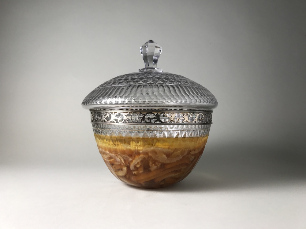 Ronde kristallen coupe (1274.1.2) met deksel (1274.1.3) en onderschotel (1274.1.1), met zilver gemonteerd.