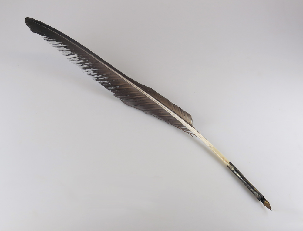 Op 13 december 1907 brachten koningin Wilhelmina (1880-1962) en haar echtgenoot prins Hendrik (1876-1934) een bezoek aan het Amsterdamse Burgerweeshuis. Het Burgerweeshuis was destijds nog gevestigd in het huidige pand van het Amsterdam Museum. Bij hun bezoek tekende het koninklijke echtpaar het gastenboek met deze adelaarsveer met pen. Wilhelmina heeft tot 1948 geregeerd. ( Sarah Remmerts de Vries)