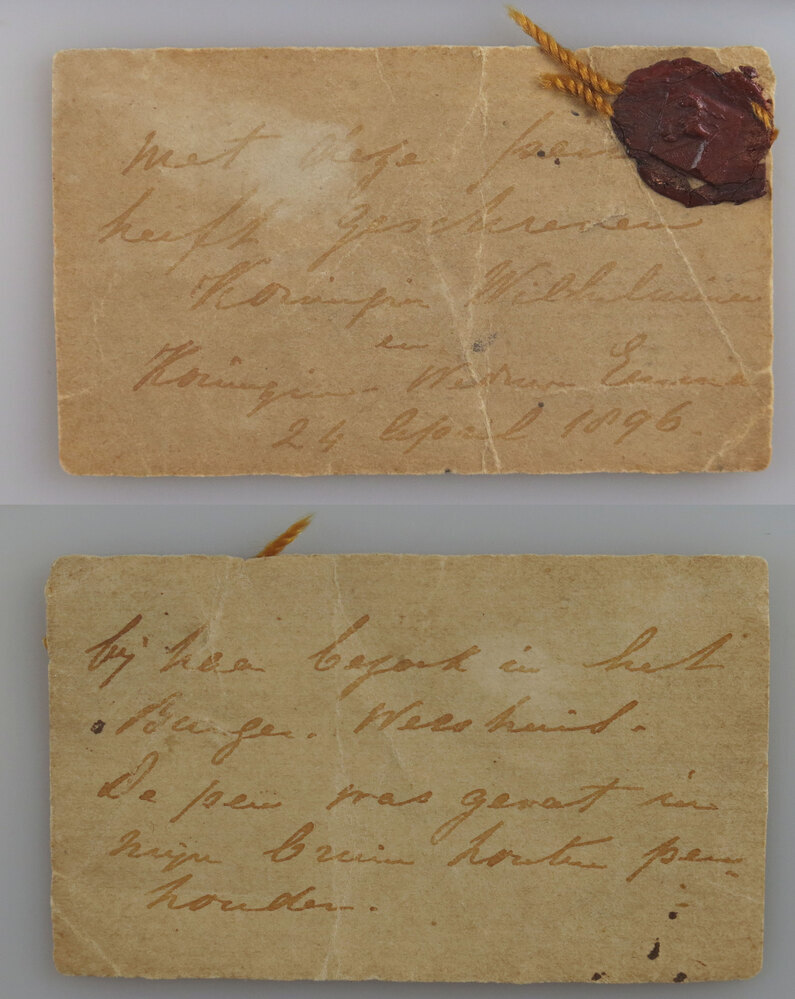 Kaartje met lakstempel en opschrift: "met deze pen heeft geschreven Koningin Wilhelmina en Koningin-Weduwe Emma 24 April 1896 bij haar bezoek in het Burger-Weeshuis. De pen was gezet in mijn bruin houten penhouder."