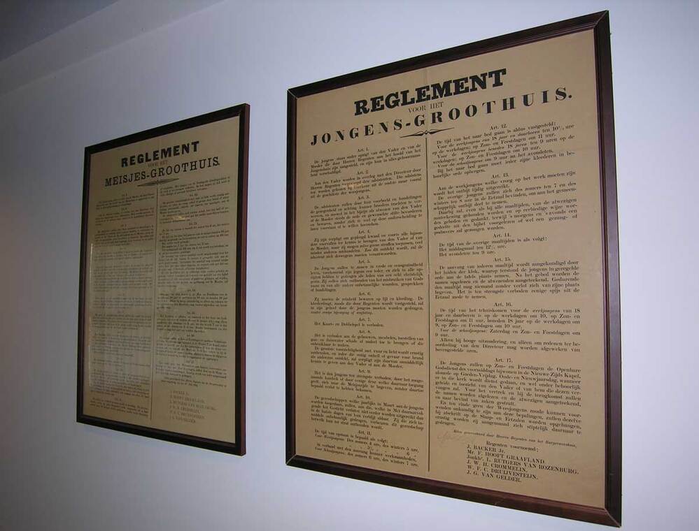 In het Amsterdamse Burgerweeshuis konden kinderen van Amsterdamse poorters (burgers met rechten om in de stad te wonen) terecht, die geen ouders of een moeilijke thuissituatie hadden. Weesjongens en –meisjes leefden in het weeshuis veelal een gescheiden bestaan. Ze hadden aparte gebouwen met slaapzalen en zelfs aparte binnenplaatsen om te zitten en spelen. Terwijl de oudere jongens overdag buiten de deur een ambacht leerden, bleven de grote meisjes binnen, waar ze opgeleid werden tot nette huisvrouw. Voor beide groepen golden andere regels, toegespitst op verschillen in het gedrag en de dagindeling. De regels werden aan het eind van de negentiende eeuw vastgelegd in deze reglementen van het Jongens- en Meisjes-Groothuis. ( Sarah Remmerts de Vries)