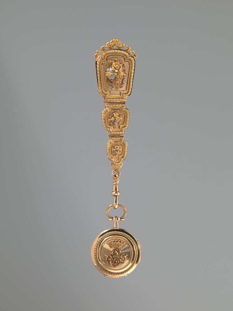 - Horloge met cilindergang versierd met een monogram SA en bijpassende chatelaine, 1870 - 1890