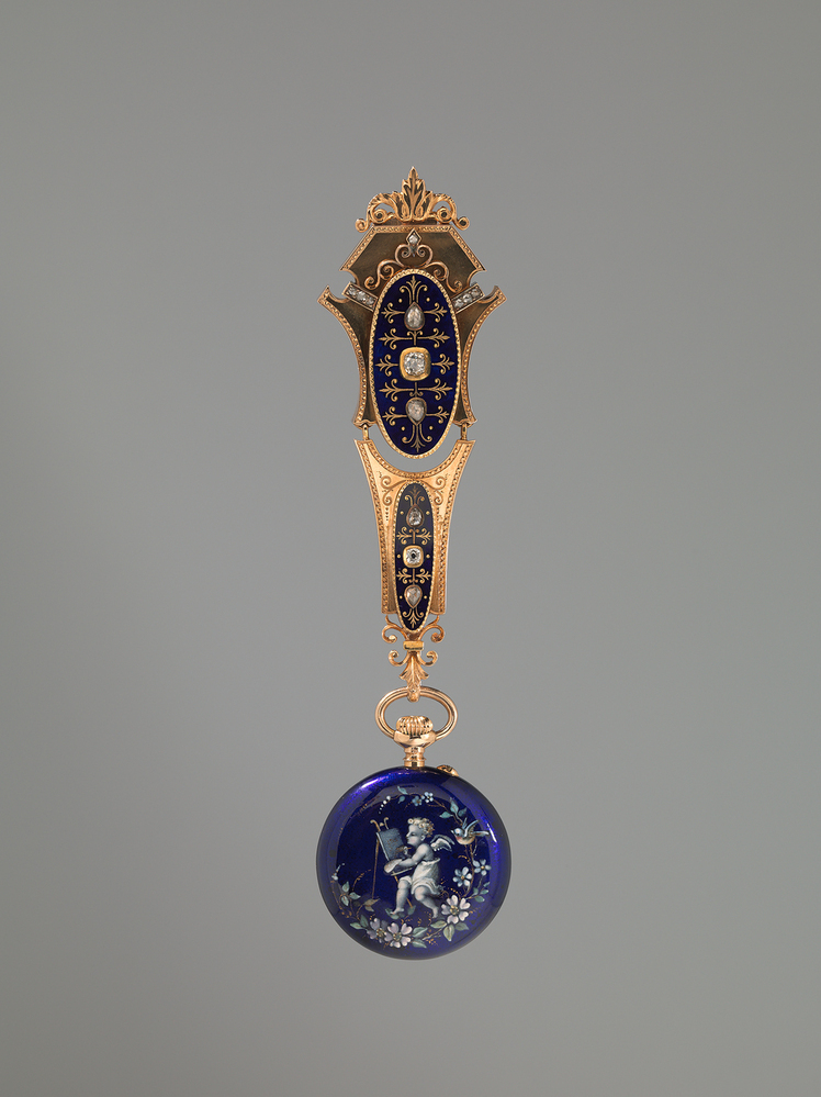 - Remontoir horloge met emailvoorstelling van putto bij schildersezel met bijpassende chatelaine, 1865 - 1885