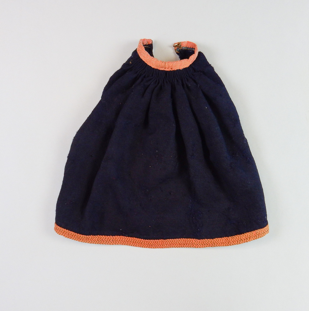 Donker blauwe rok afgewerkt met wolle bies bij de zoom en bij de taille. Aan de achterkant plooien. Sluiting aan de voorkant met haakje. Wijder gemaakt met touwtje.- Trefwoorden