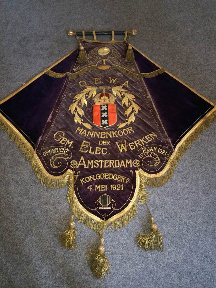 Het Gemeente-Energiebedrijf (GEB) was een tak van dienst van de gemeente Amsterdam, belast met de opwekking en verdeling van elektriciteit in de stad. Het GEB ontstond in 1941 uit een samenvoeging van de Gemeente-Electriciteitswerken (GEW) en de Gemeente-Gasfabrieken, beide rond 1900 opgericht. De elektriciteit werd opgewekt in GEB-centrales, zoals de voormalige Centrale Noord en de Centrale Hemweg. Het personeel van het GEB had destijds een eigen mannenkoor, dat G.E.W.A. heette. Dit is hun vaandel, gemaakt van kostbare stoffen en gouddraad. In 1994 is het GEB verzelfstandigd. Alle faciliteiten kwamen in het bezit van NUON, dat vanaf 2009 overgenomen is door de Zweedse energiemaatschappij Vattenfall. ( Sarah Remmerts de Vries)