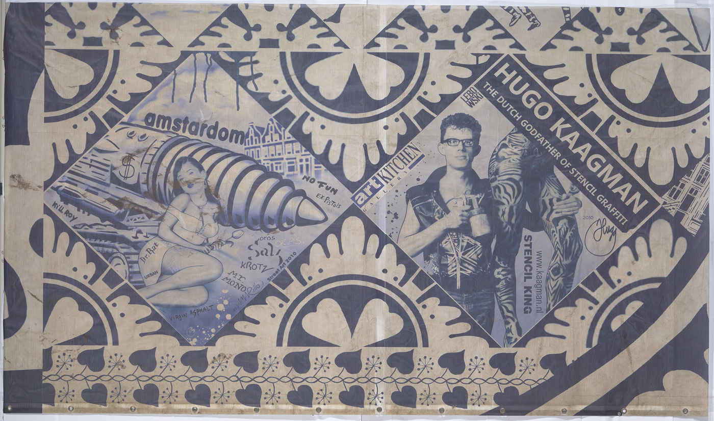 opschrift / signatuur rechts: Hugo Kaagman / The Dutch godfather of stencil graffiti / Lebo / wski / Art Kitchen / Gallery / www.kaagman.nl / Stencil King / 2010 Hugg