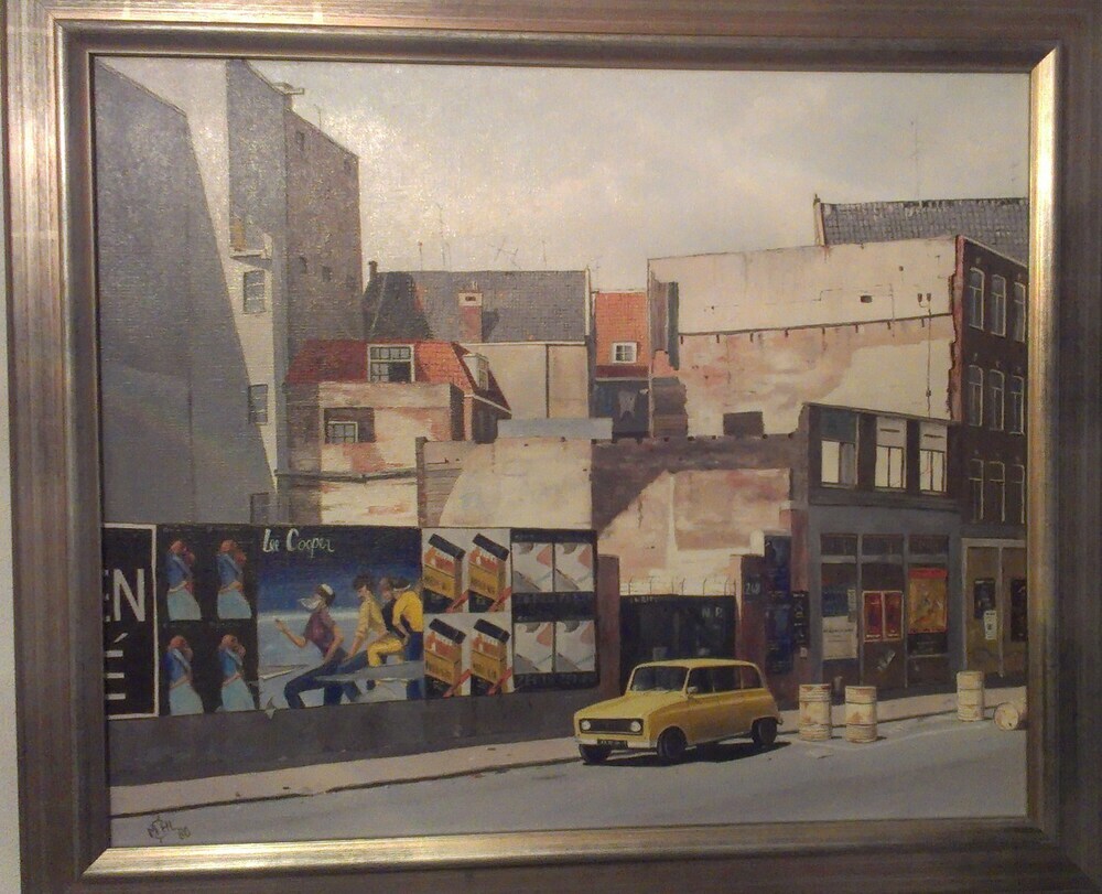 Kunstenaar Rob Møhlmann (1956-) legde rond 1980 allerlei vervallen stukjes Amsterdam vast. Dit braakliggende terrein in de Spuistraat kent een interessante geschiedenis: van rijwielhandel Westor, slachtoffer van een grote brand in 1963 en achteringang van Men’s Club Yab Yum, tot een modern appartementencomplex, met wederom een fietsenwinkel op de begane grond. Møhlmanns schilderij vat dit unieke lot samen in een samenspel van verweerde muren, kapotte ramen, prikkeldraad, reclameposters en olievaten. De gele Renault 4 is het enige onaangetaste in deze stadse wildernis. ( Sarah Remmerts de Vries)