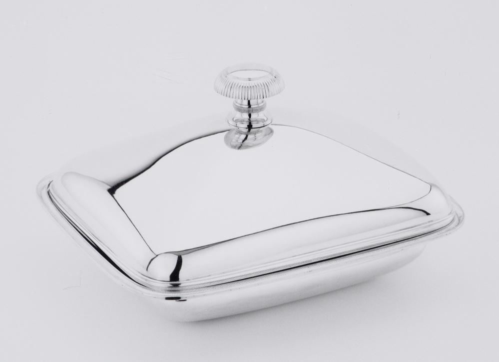 Afgeronde rechthoekige schaal met deksel. Gladde, gewelfde wand met uitspringende geribde rand. Glad deksel met paddestoelvormige knop met twee geribde randen, de bovenzijde met filetranden.