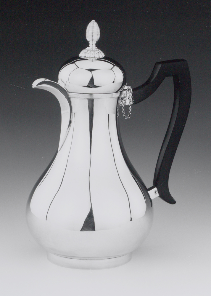 Koffiekan met rechte standring, glad peervormig lichaam en scharnierend deksel. Gefacetteerde schenksneb en C-vormig, hoekig gebogen ebbenhouten oor in zilveren vattingen. Filetranden langs bovenrand lichaam. Helmvormig deksel met rozet en eivormige, geribde knop. Scharnier met uitneembare stift aan ketting ter verwijdering van deksel.