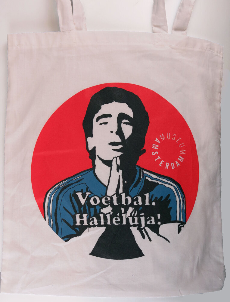 De tentoonstelling Voetbal Halleluja! was van 12 september 2014 tot en met 4 januari 2015 te zien in het Amsterdam Museum. Kamp Seedorf, een street art collectief uit Almere, ontwierp het logo van de tentoonstelling: een biddende Maradona tegen een achtergrond in Amsterdam Museum rood. Dit logo verscheen op al het promotiemateriaal van de tentoonstelling, waaronder linnen tasjes, T-shirts, gebedskaarsen en stickers. ( Sarah Remmerts de Vries)