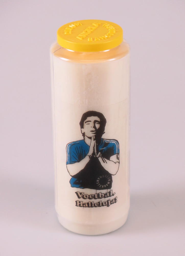 De tentoonstelling Voetbal Halleluja! was van 12 september 2014 tot en met 4 januari 2015 te zien in het Amsterdam Museum. Kamp Seedorf, een street art collectief uit Almere, ontwierp het logo van de tentoonstelling: een biddende Maradona tegen een achtergrond in Amsterdam Museum rood. Dit logo verscheen op al het promotiemateriaal van de tentoonstelling, waaronder linnen tasjes, T-shirts, gebedskaarsen en stickers. ( Sarah Remmerts de Vries)