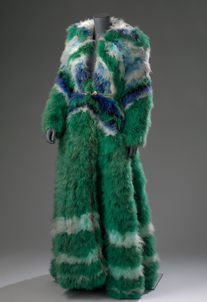 Voetlange nauwgetailleerde mantel, geheel opgewerkt met groene marabouveren. De taille- en heupaccenten zijn verkregen door zigzagsgewijs ingezette banen van grijze en blauwe marabouveren. De voering is van satijn en heeft incustraties meelopend in het zigzagfiguur van de marabouveren in corresponderende kleuren.