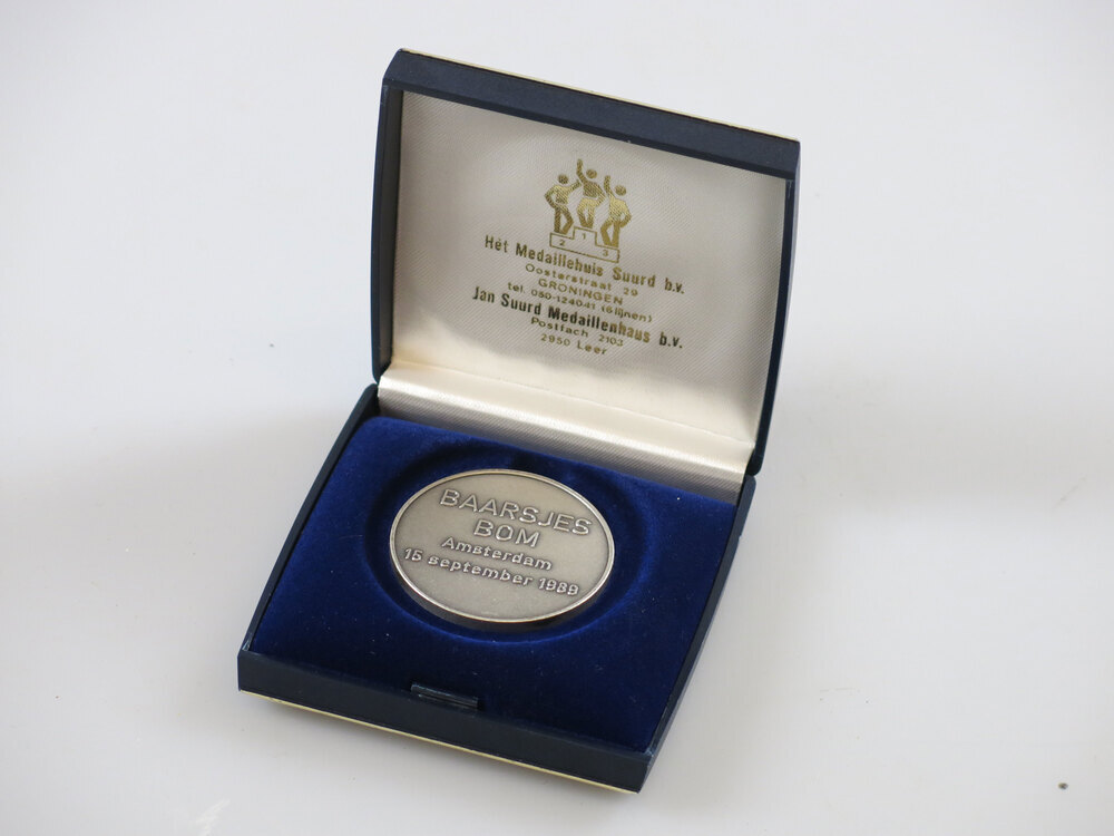Op 15 september 1989 ruimden manschappen van de Explosieven Opruimingsdienst een bom, die al ruim veertig jaar in een achtertuin van een huis aan de Amsterdamse Baarsjesweg lag. De kans op ontploffing was al die tijd klein, omdat de ontsteking van de bom was afgebroken. De zogenaamde ‘Baarsjesbom’ is uiteindelijk in het Westelijke Havengebied tot ontploffing gebracht, met een lichtelijk tegenvallende knal. Ter gelegenheid van de opruiming werd door Medaillehuis Suurd b.v. hetzelfde jaar een penning uitgebracht. De ene zijde van de penning toont een baars, symbool voor de wijk de Baarsjes, op een vliegende bom. Op de andere zijde is de tekst ‘BAARSJES BOM - Amsterdam 15 september 1989’ te lezen. ( Sarah Remmerts de Vries)