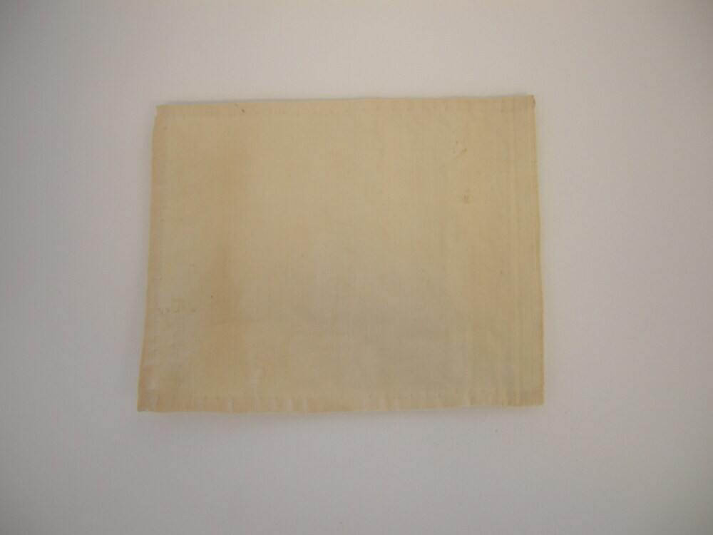Wit katoenen lapje, waarschijnlijk is dit het laken voor het kleine houten bed uit het poppenhuis. Het katoenen lapje is aan alle zijden voorzien van een zoom.