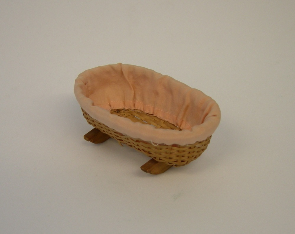 Houten schommelwiegje van gevlochten riet met houten onderstel. De wieg is met roze stof bekleed over de rand en aan de binnenzijde. Nummers KA 19764.37 t/m KA 19764.42 horen bij dit wiegje.