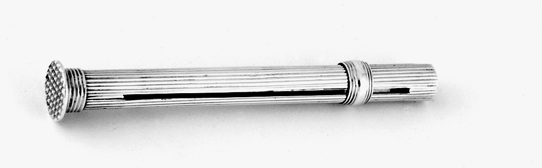 Langwerpige rechte gegroefde houder met een platronde geruite vaste dop, verschuifbare geringde band; deze band schuift in een gleuf en is verbonden met de potloodklemring in de houder. (potlood ontbreekt)- Trefwoorden
