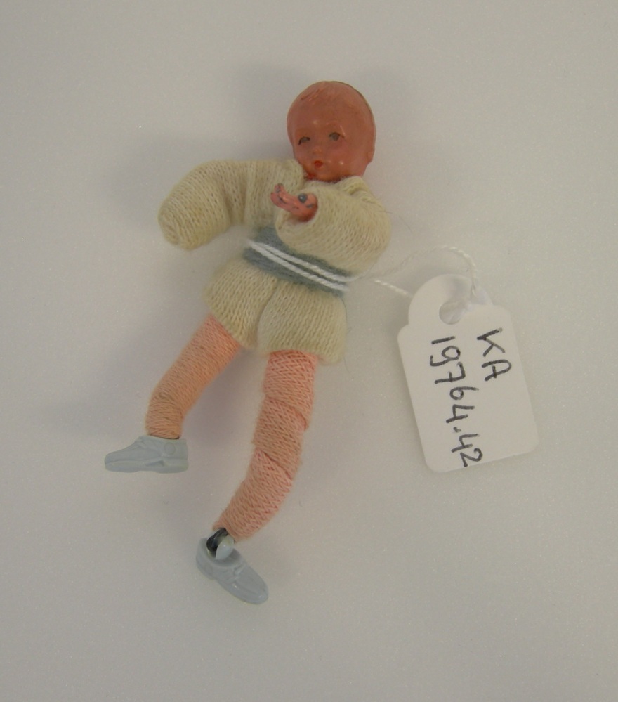 Popje van metaal en kunststof. Blauwe schoentjes, wit jasje met blauwe band om de taille, roze benen van stof met daarin een ijzerdraadje. Dit is de baby voor in de wieg.