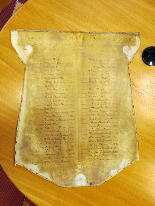 Dit perkamenten vel toont een jaarlijst met de namen van regenten van het Burgerweeshuis, in de periode 1708 tot 1853. Het vel zat tot in de twintigste eeuw bevestigd in een versierde omlijsting, gemaakt in opdracht van de eerste regenten die op het vel te lezen zijn. Deze omlijsting draagt eveneens zes familiewapens van die regenten. De allereerste op de lijst is Gerard Rogge de Jonge. Andere bekende familienamen zijn Huydecoper, Den Tex en Bicker. Het perkamenten vel in omlijsting was bedoeld voor de regentenkamer van het Burgerweeshuis. In de twintigste eeuw is de perkamenten jaarlijst uit zijn oorspronkelijke omlijsting verwijderd, om plaats te maken voor een leeg vel. Dit nieuwe vel, waarop slechts vijf namen geschreven zijn, zit er tegenwoordig nog steeds in. Het geheel hangt op dit moment in de regentenkamer van het Amsterdam Museum, het voormalige Burgerweeshuis. ( Sarah Remmerts de Vries)