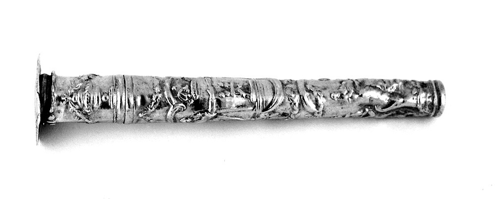 Ronde, taps toelopende koker met afschroefbare dop, de vierhoekige bovenzijde met afgeschuinde hoeken. Decors in stampwerktechniek. Wand van koker met huwelijksceremonie onder een kroon, en daar onder een Caritas, symbool van de naastenliefde, moeder met twee kinderen . Op signetten is ingegrift: B.M. Grootes. Wand van de dop is versierd met twee urnen en guirlandes.