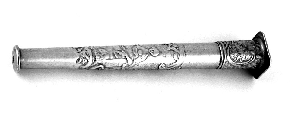Ronde, taps toelopende koker met afschroefbare dop, de vierhoekige bovenzijde met afgeschuinde hoeken. Decors in stampwerktechniek. Wand van koker met Caritas, symbool van de naastenliefde. Op ? is ingegrift: I.H/. Wand van dop met ?- HerkomstSophia Augusta Stichting, Amsterdam; herkomst en jaar van verwerving onbekend.