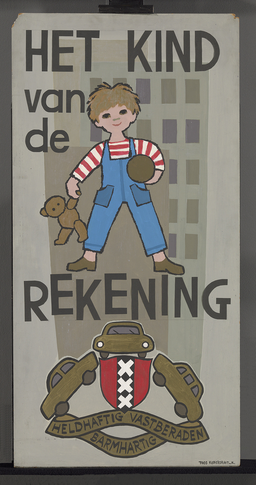 Toen in de jaren ’60 steeds meer gezinnen een auto kregen, ontstond er grote drukte op de Amsterdamse wegen. De linkse actiekunstenares Toos Koedam (1924-2006) zag haar eigen kinderen, die op hun fietsjes door de drukte heen moesten laveren, als het spreekwoordelijke ‘kind van de rekening’. Met twee beschilderde panelen tekende ze protest aan tegen de gevaarlijke en vervuilende gevolgen van het autogebruik in Amsterdam. Dit paneel toont een grauwe doorsnede van de stad. Smog, afkomstig uit schoorstenen en auto’s, hangt in dikke slierten boven de huizen en kleurt de te drogen hangende was grijs. In de voorgrond spelen kinderen in een geasfalteerde speeltuin en tussen het vuil van twee overvolle afvalbakken. Tussen de huizen lopen donkere, anonieme gedaantes. Een troosteloze blik op het leven in de grote stad. ( Sarah Remmerts de Vries)