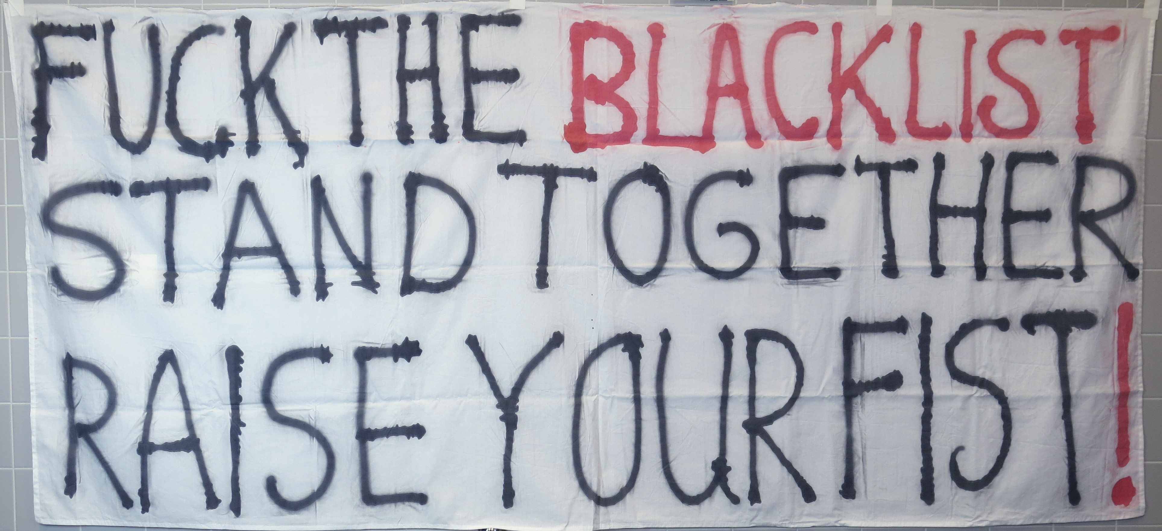 Dit spandoek is gebruikt tijdens een van de protestmarsen tegen het College van Bestuur van de Universiteit van Amsterdam. Daarnaast heeft het gehangen in het Maagdenhuis tijdens de bezetting in maart 2015. Sinds de Maagdenhuisbezetting van 1969 is het gebouw van de Universiteit van Amsterdam meer dan tien keer bezet geweest. De bezetting van 2015 was de langste tot nu toe en uniek vanwege het internationale draagvlak. Met deze actie wilden de bezetters de problemen binnen de UvA aan de kaak stellen. De frustratie over de verkoop van UvA-gebouwen, zoals het Bungehuis, in combinatie met het rendementsdenken aan de universiteit, werd geuit op internet en op spandoeken, zoals deze. Het opschrift ‘Fuck the Blacklist, stand together, raise your fist!’ verwijst naar de houding van het CvB tegenover docenten die sympathiseerden met de bezetters: deze zouden door de communicatieafdeling op een zwarte lijst (blacklist) geplaatst zijn. Veel docenten vreesden voor hun baan, omdat ze geen vast contract bij de UvA hadden. Voor hen nog een reden om zich bij de bezetters aan te sluiten. ( Sarah Remmerts de Vries)