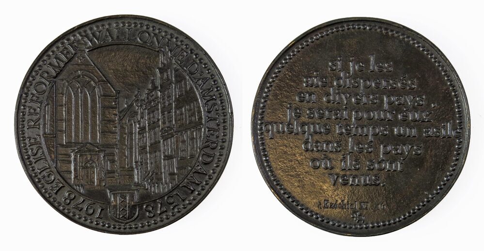 Deze bronzen penning is uitgebracht ter gelegenheid van het vierhonderdjarig bestaan van de Waalse Kerk te Amsterdam, dat werd gevierd in 1978. Dit jubileum doet vermoeden dat de kerk in 1578 gebouwd is, maar niets in minder waar. Het gebouw aan het Walenpleintje stamt namelijk uit de vijftiende eeuw, toen het bewoond werd door de Sint-Paulusbroeders. De Alteratie (1578), waarbij het katholieke stadsbestuur van Amsterdam afgezet werd en de stad de protestantse zijde koos, gaf de kerk echter een nieuwe bestemming. De Paulusbroederkerk werd ter beschikking gesteld aan protestanten die uit Frankrijk en de Zuidelijke Nederlanden naar Amsterdam waren gevlucht. De naam ‘Waalse Kerk’ (of Eglise Wallonne) die de kerk toen heeft gekregen, wordt tegenwoordig nog steeds gehanteerd.