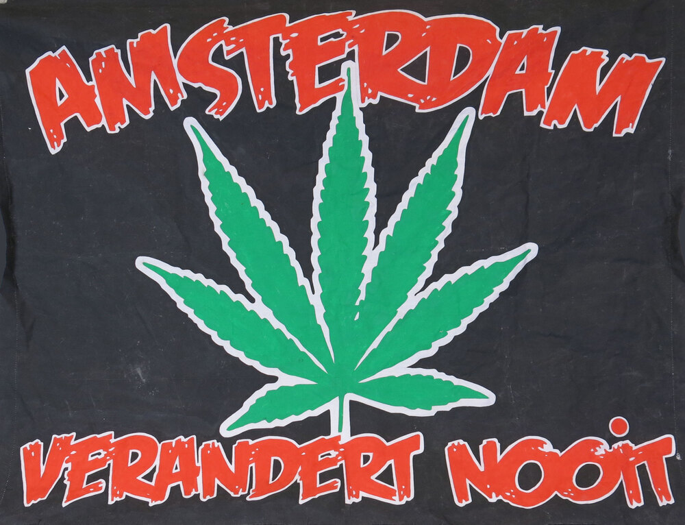 Een bandieri is een klein formaat, handbeschilderd doek dat door supporters getoond wordt in de sfeervakken. Deze bandieri was in 2013 te zien in Vak 410. Als supportersgroepering ben je niet alleen trots op je club, maar ook op de stad waar de club vandaan komt. Onmiskenbaar onderdeel van de Amsterdamse identiteit is het gedoogbeleid. Als één van de krachtigste symbolen van de stad mag het wietblad dan ook niet ontbreken op de tribune. En hoewel roken officieel verboden is in de ArenA, kan men zich in Vak 410 van tijd tot tijd in een Amsterdamse coffeeshop wanen. ( Annemarie de Wildt)
