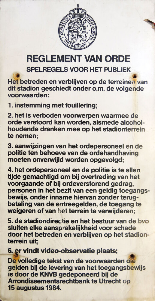 Jeroen Geerligs, vaste bezoeker van Vak F, schroefde dit ‘reglement van orde’ van een muur van stadion De Meer voor zijn Ajax-verzameling. Het reglement is opgesteld door de KNVB in 1984. In de jaren ’80 van de 20ste eeuw werden videocamera’s in het stadion geïnstalleerd, voorlopig alleen gericht op Vak F. Het getuigt van het toemenend geweld in en rond het stadion in de jaren tachtig en de manier waarop de KNVB en voetbalclub daartegen optraden. ( Annemarie de Wildt)