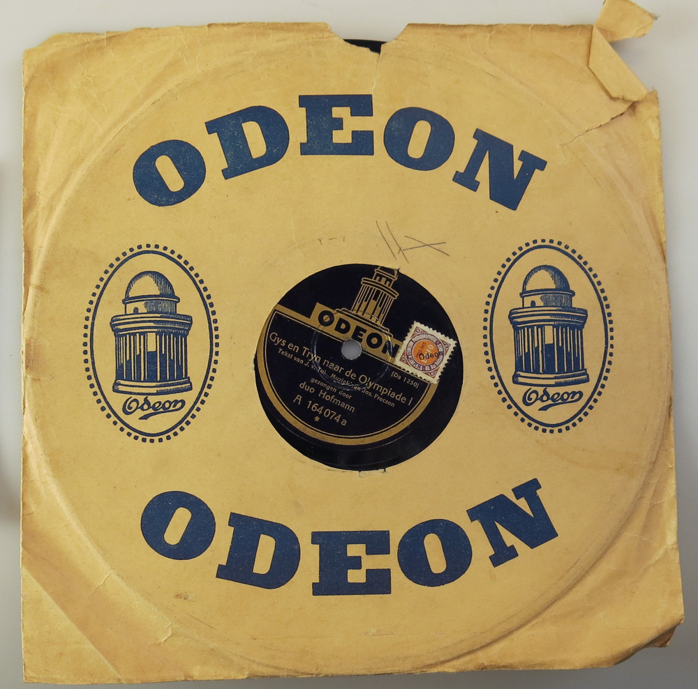 Deze grammofoonplaat is uitgegeven ter gelegenheid van de Olympische Spelen van 1928 te Amsterdam. De plaat bevat het muzikale hoorspel ‘Gys en Tryn naar de Olympiade’, gezongen door het duo Hofmann naar een tekst van Jacques van Tol (1897-1969). Van Tol was van 1920 tot aan zijn dood een van de belangrijkste Nederlandse tekstschrijvers voor kleinkunstartiesten, onder wie Louis Davids en het komische duo Snip en Snap. Het duo Hofmann, bestaande uit George Hofmann (1890-1957) en zijn vrouw Truus Meijer, stond bekend om het zingen van levensliederen. ( Sarah Remmerts de Vries)