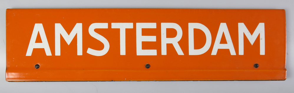 Dit geëmailleerde bewegwijzeringsbord werd door de ANWB ingezet tijdens de Olympische Spelen van 1928 te Amsterdam. Voor de Olympiade kwamen bezoekers uit de hele wereld naar de Nederlandse hoofdstad, waardoor een goede bewegwijzering noodzakelijk was. Op dit bord steken de witte letters ‘AMSTERDAM’ duidelijk af tegen de feloranje achtergrond. Zo zijn ze ook van een afstand nog te lezen. ( Sarah Remmerts de Vries)